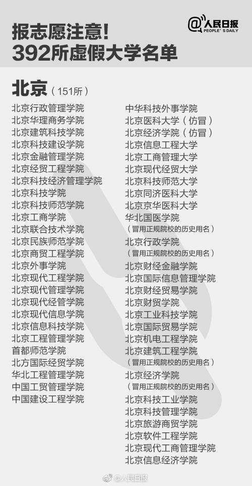 人民日报6月26日消息,近日,各地高考成绩陆续公布,马上要报志愿,警惕这些虚假大学陷阱!这些学校部分仿冒正规高校的校名,学校简介多是抄袭拼凑而成,部分“野鸡学校”被曝光多次仍换个域名继续存在。全国392所“野鸡大学”名单。